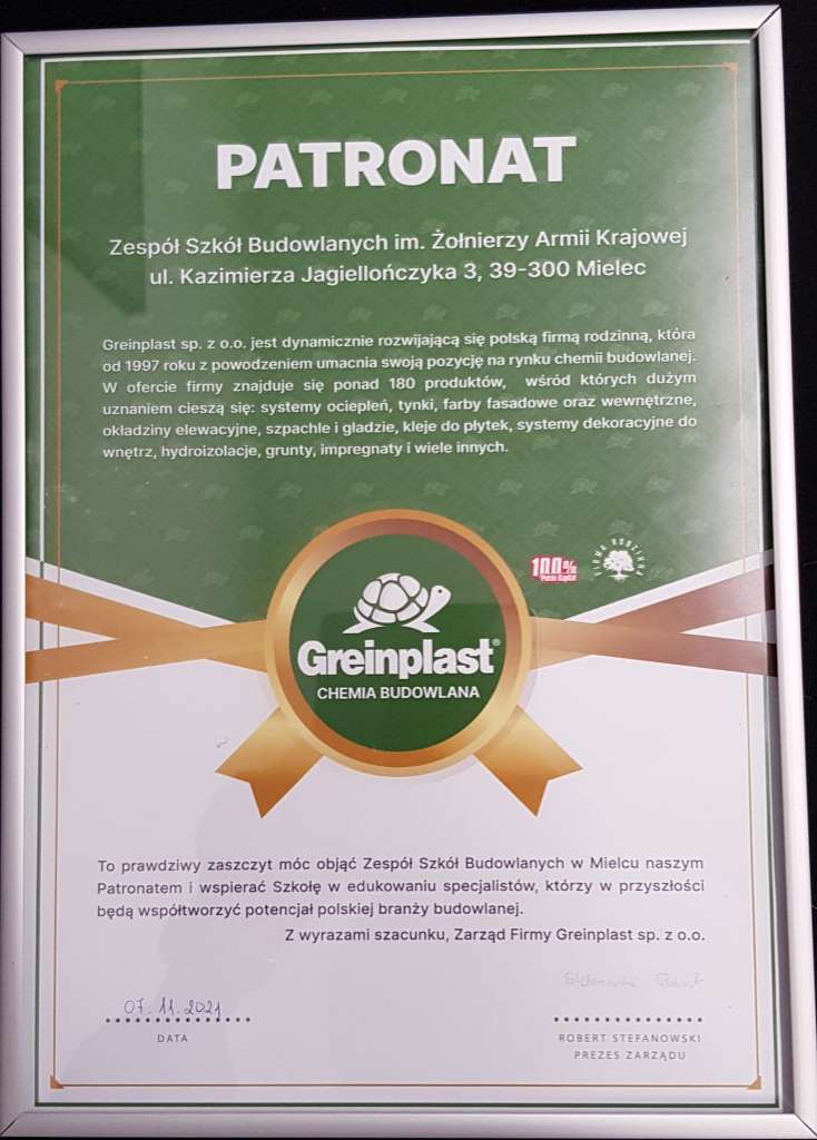 7 czerwca 2021r. Zespół Szkół Budowlanych im. Żołnierzy Armii Krajowej w Mielcu uzyskał patronat firmy Greinplast sp. z o.o., która jest jedną z najprężniej działających firm chemii budowlanej. Menedżer ds. marketingu firmy Greinplast sp. z o.o. Monika Hajduk przekazała na ręce dyrektora ZSB Stanisława Starzyka i wicedyrektora ZSB Mielec Adama Snopkowskiego oraz koordynatora szkolnego Marii Pietras dokument potwierdzający objęcie patronatem mieleckiej placówki oświatowej. Należy podkreślić, że firma od wielu lat wspiera mielecką ,,budowlankę’’ poprzez cykliczne szkolenia organizowane dla uczniów i nauczycieli. Greinplast sp. z o.o nie tylko wspiera w kształceniu przyszłych specjalistów branży budowlanej, ale także jest fundatorem wielu nagród dla uzdolnionej młodzieży mieleckiej „budowlanki”. Ścisła współpraca firmy ze szkołą jest możliwa dzięki dyrektorowi ZSB Stanisławowi Starzykowi jak również nauczycielce przedmiotów zawodowych Marii Pietras.