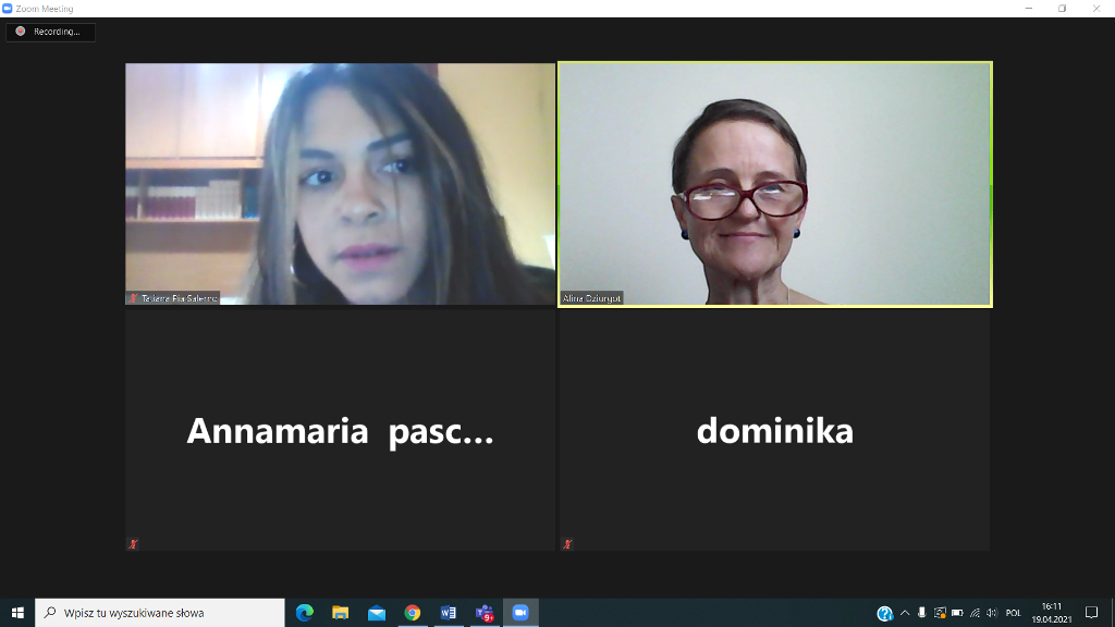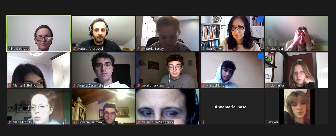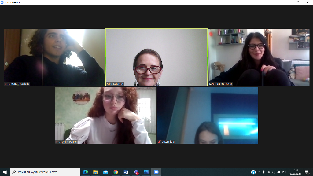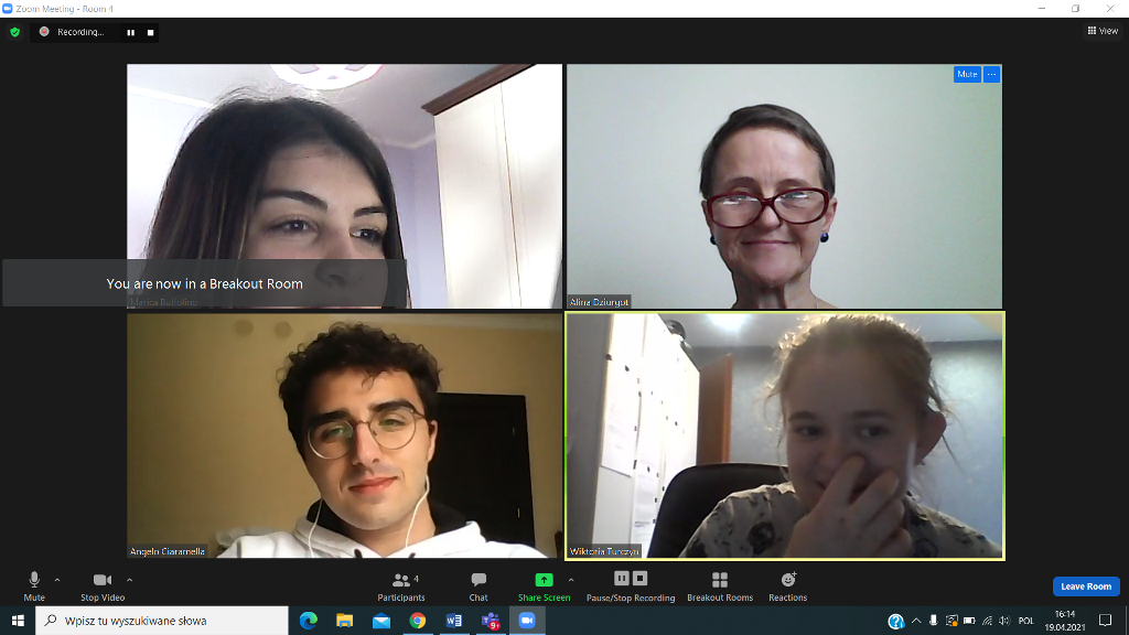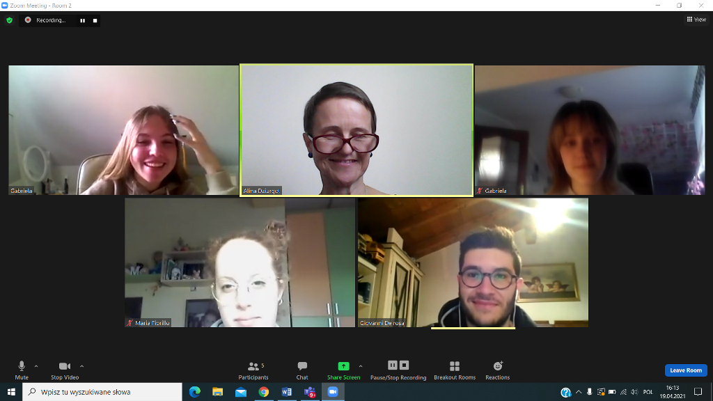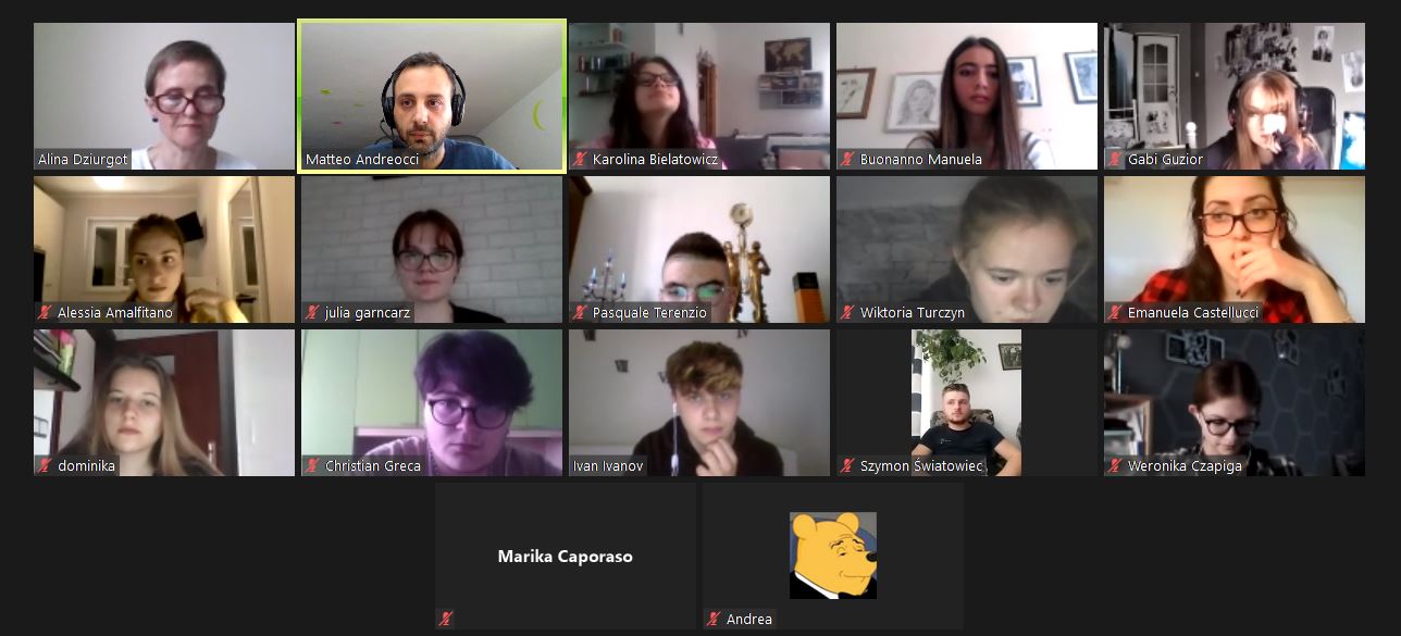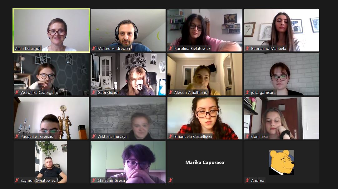 W dniu 19.04.2021 rozpoczęliśmy poznawaniem siebie. Nasi uczniowie cieszyli się na rozmowę z nowymi kolegami i koleżankami z Włoch. Pierwsze lody zostały przełamane, strach przed mówieniem po angielsku opanowany, więc tym łatwiej i przyjemniej się rozmawiało – o szkole, o zainteresowaniach, o aktualnej pogodzie we Włoszech i w Polsce i tym, co nas obecnie najbardziej dotyka, o covidzie.