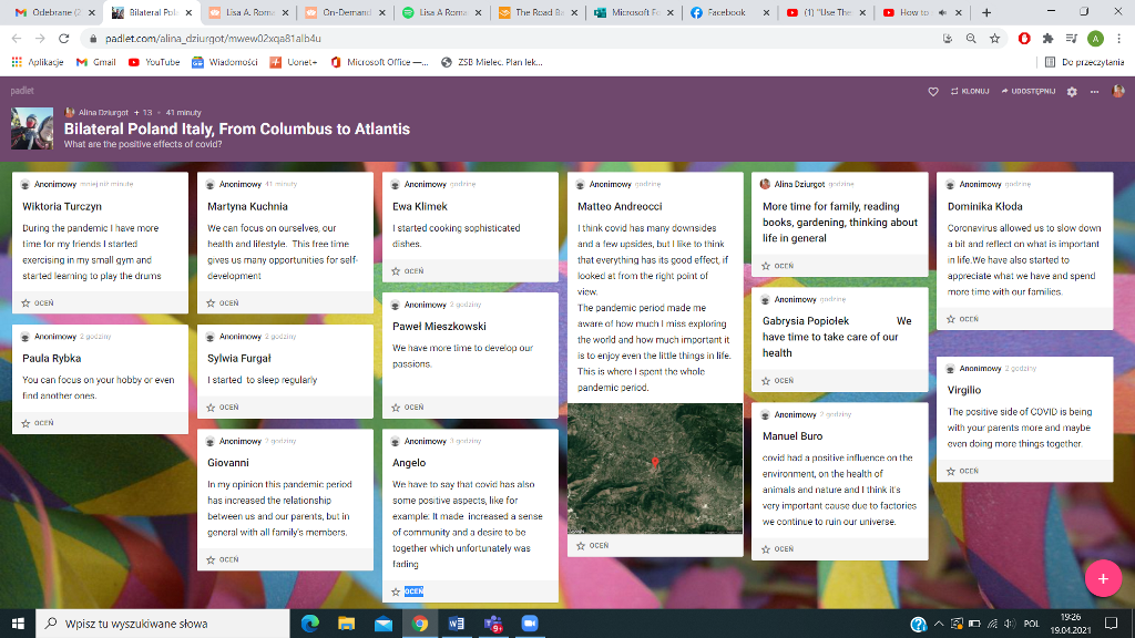 Uczniowie starali się też odkryć pozytywne strony pandemii i wpisywali swoje przemyślenia na wspólny padlet. Okazało się, że można znaleźć jakieś plusy obecnej sytuacji, np.: spędzamy więcej czasu z rodziną, czytamy więcej książek, rozwijamy nasze pasje. Zwolniliśmy i mamy więcej czasu i chęci, żeby zastanowić się nad własnym życiem.
